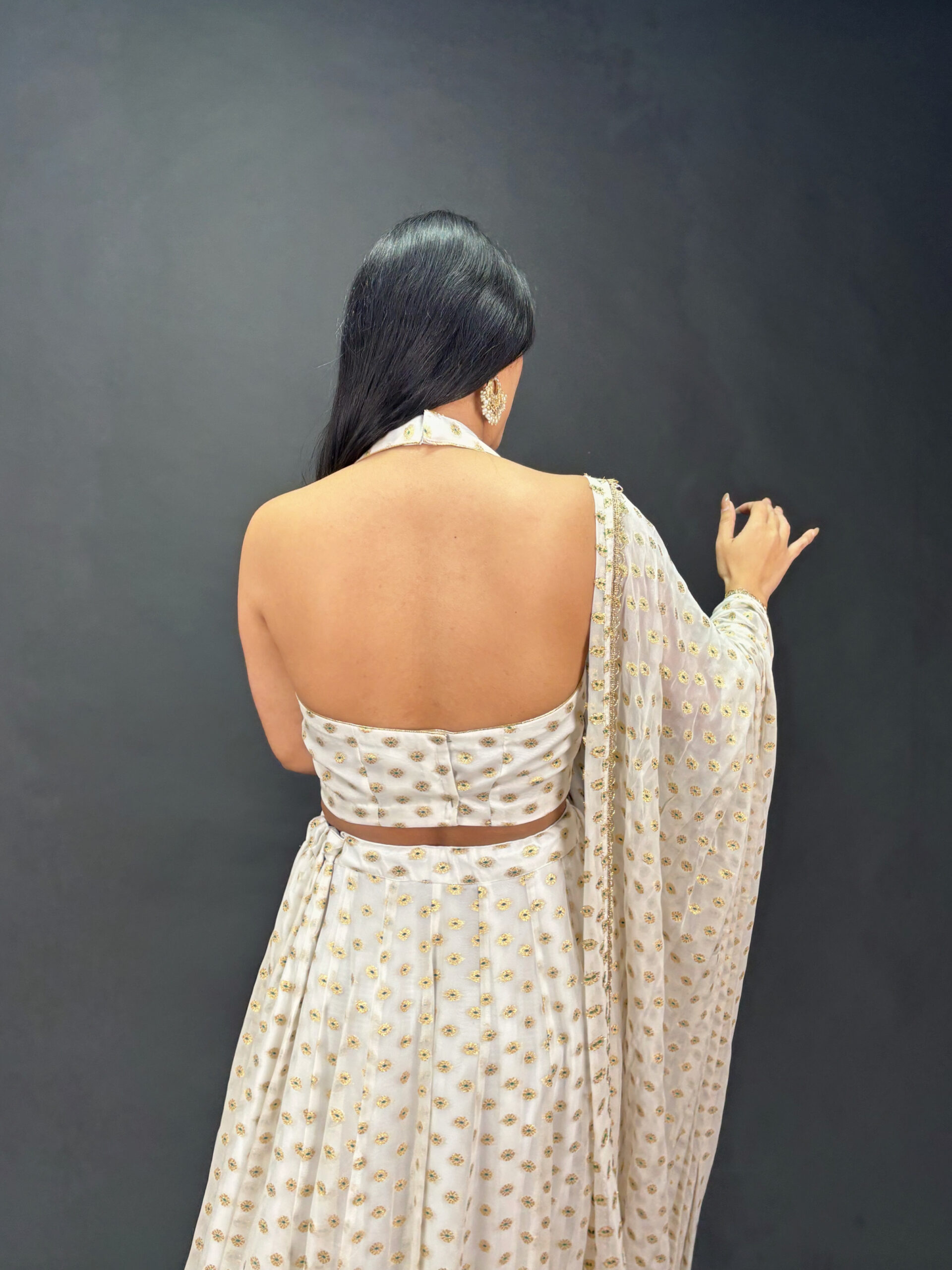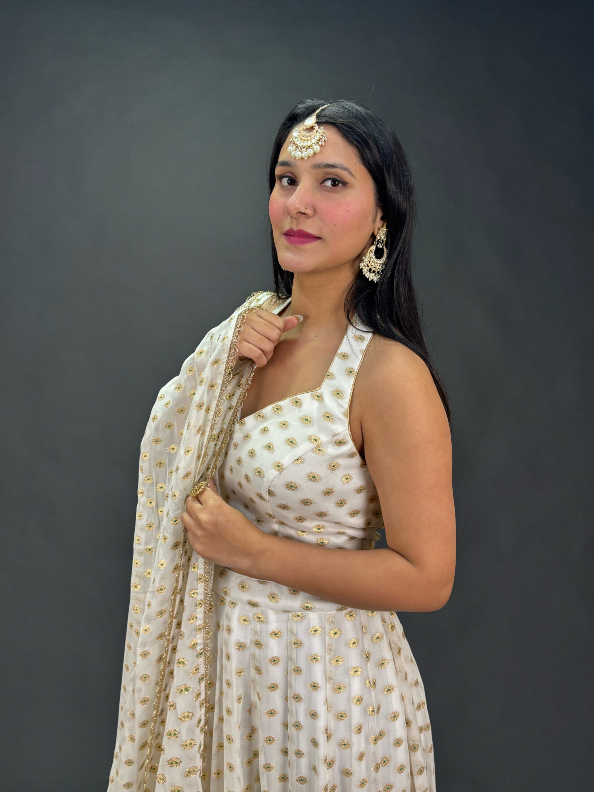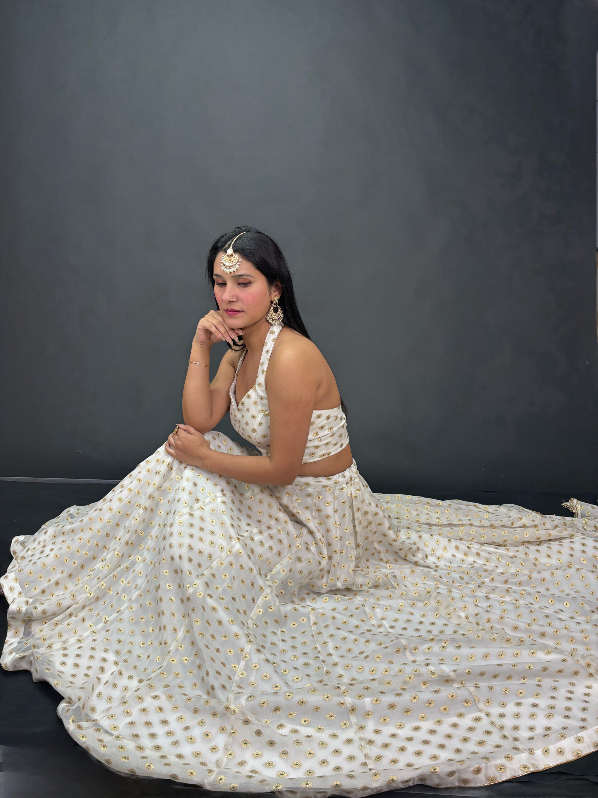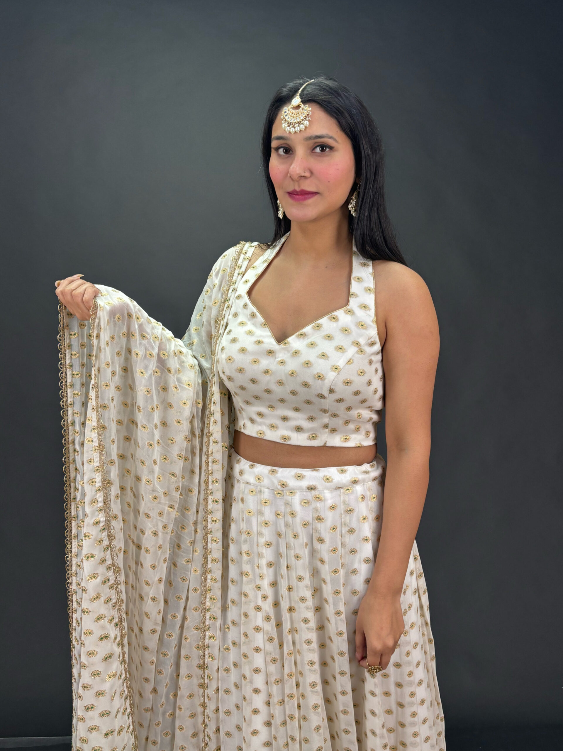 A beautifully airy and graceful white lehenga that captures an effortless festive charm. Its soft drape and elegant flow make it a perfect choice for celebrations, daytime functions, or refined evening events.