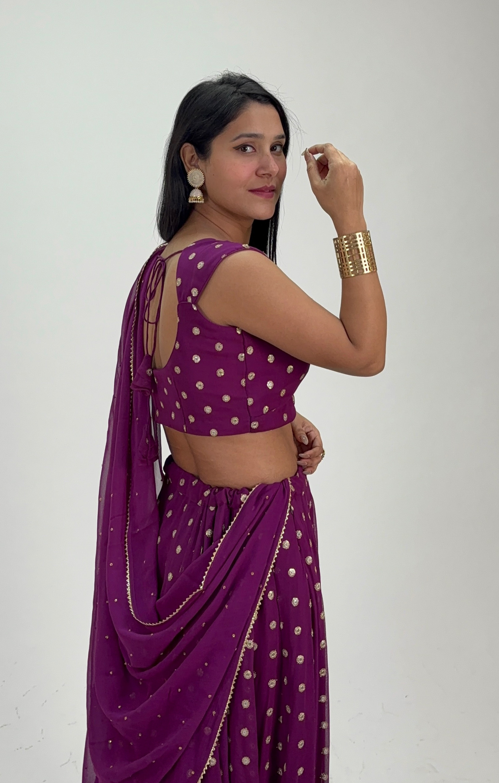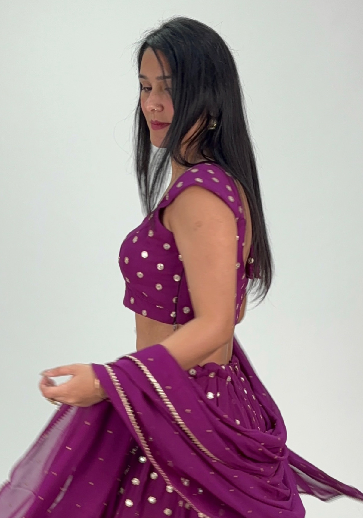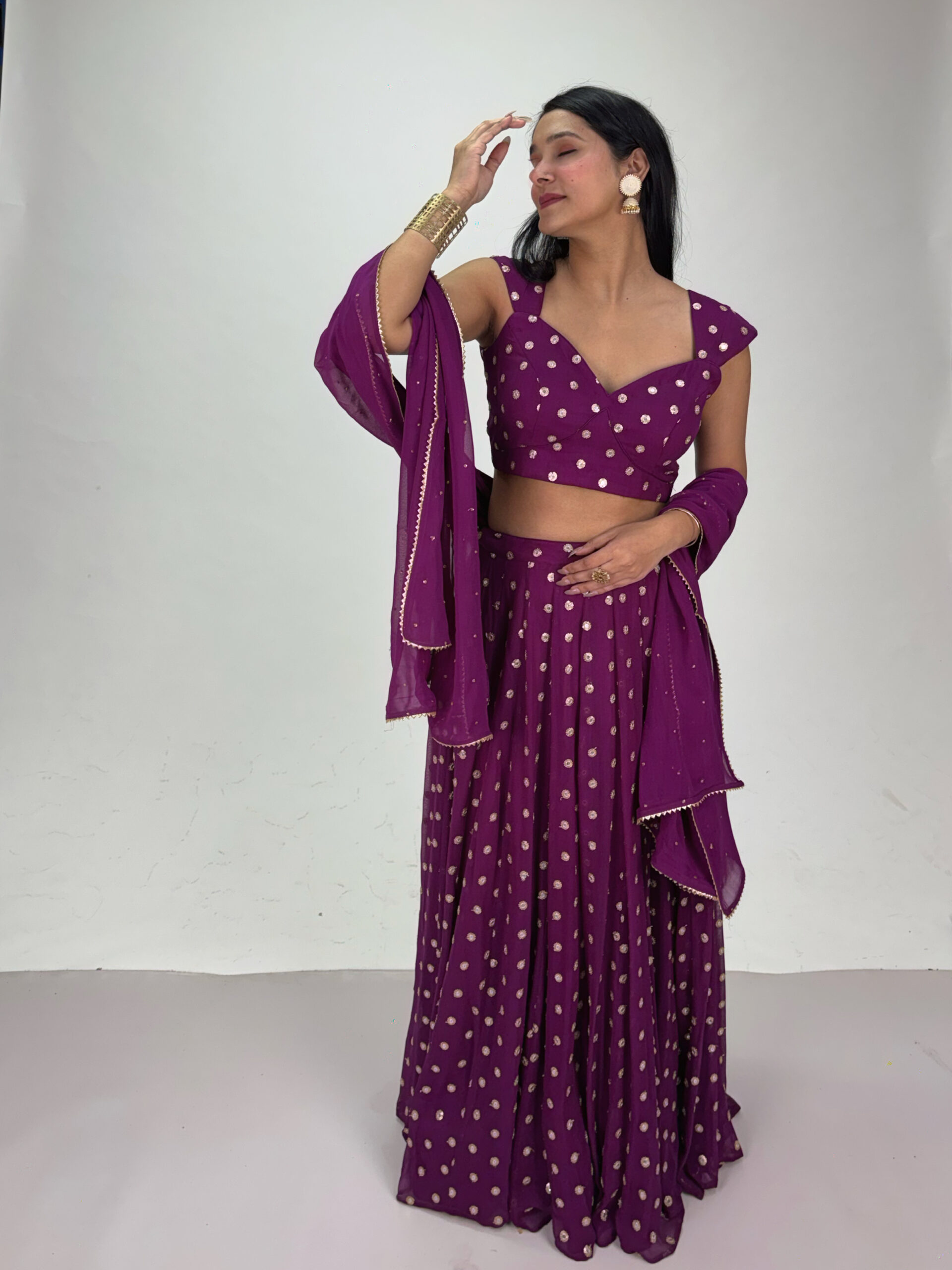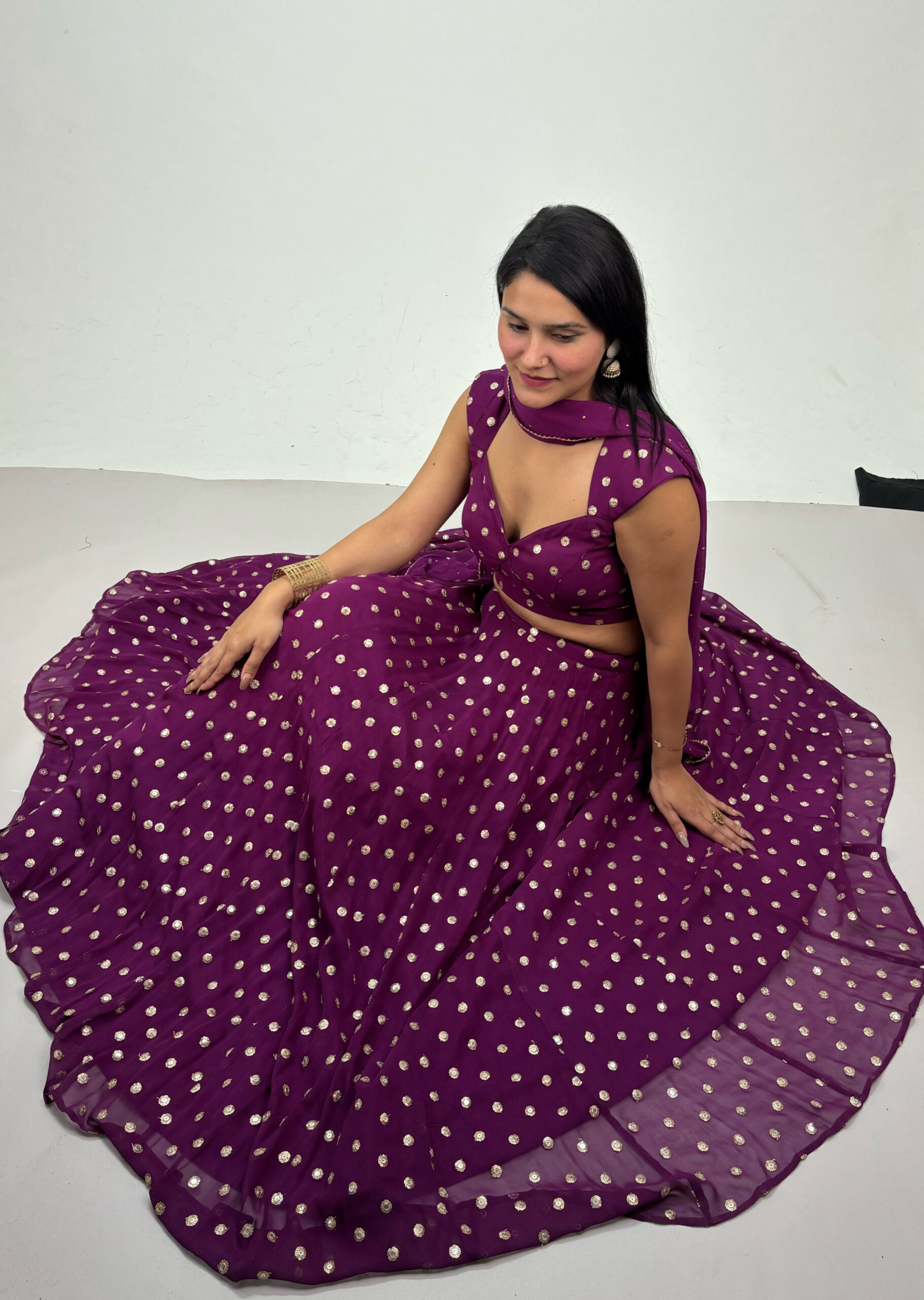 Make a regal statement with this stunning plum lehenga set, designed to bring effortless grace to any festive celebration. The rich colour, paired with its elegant flow and subtle sheen, creates a timeless look that stands out beautifully in every setting. Perfect for weddings, sangeet nights, and grand occasions, this ensemble blends tradition with contemporary charm.